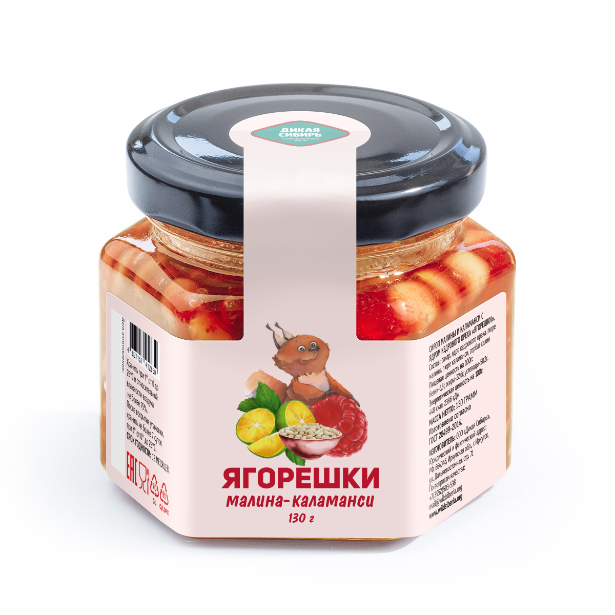 Состав: малиновое пюре, пюре каламанси, ядро кедрового ореха, сахар, сорбат калия.